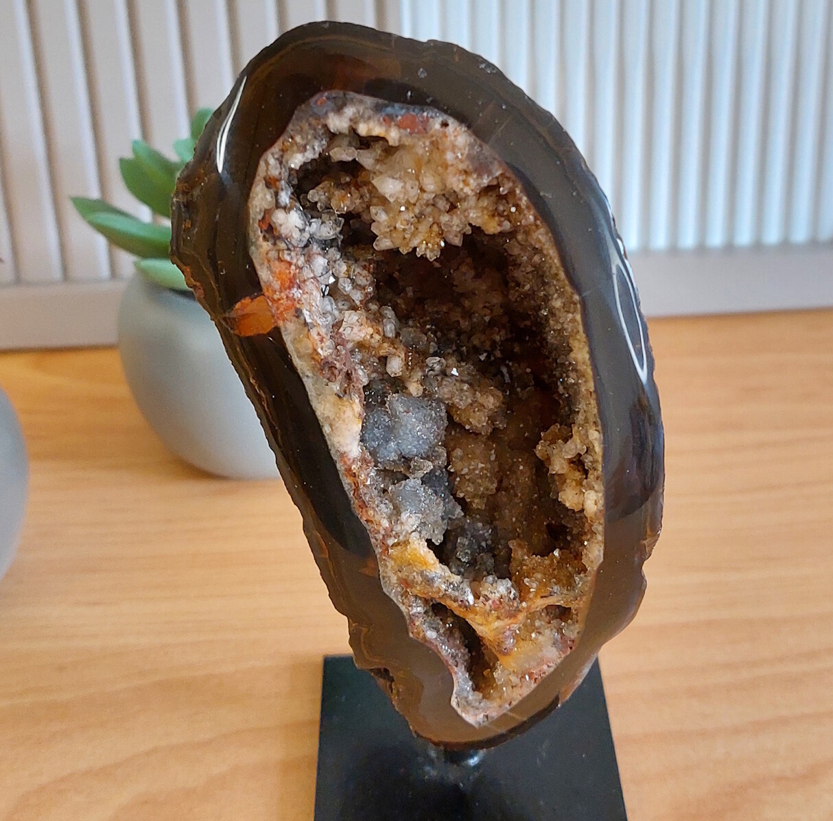Het is een echte eyecatcher, deze agaat op standaard. Veel druzy / schittering.
