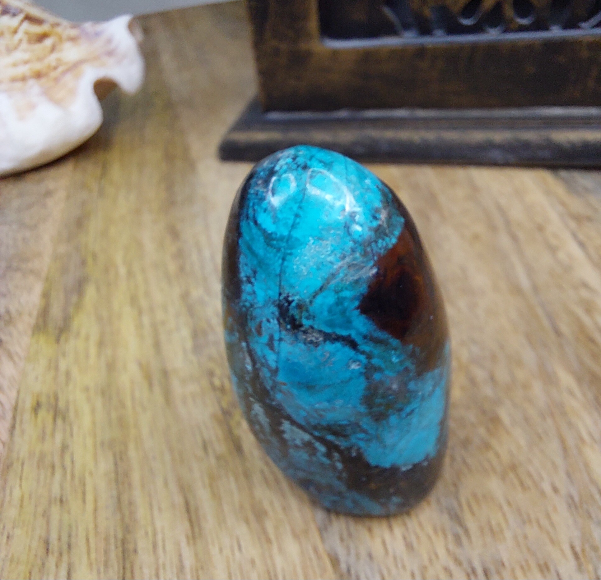 Chrycoscolla creëert een sterk zelfbewustzijn. De steen kan helpen bij verwerken van verdriet en het begrijpen van emeoties.