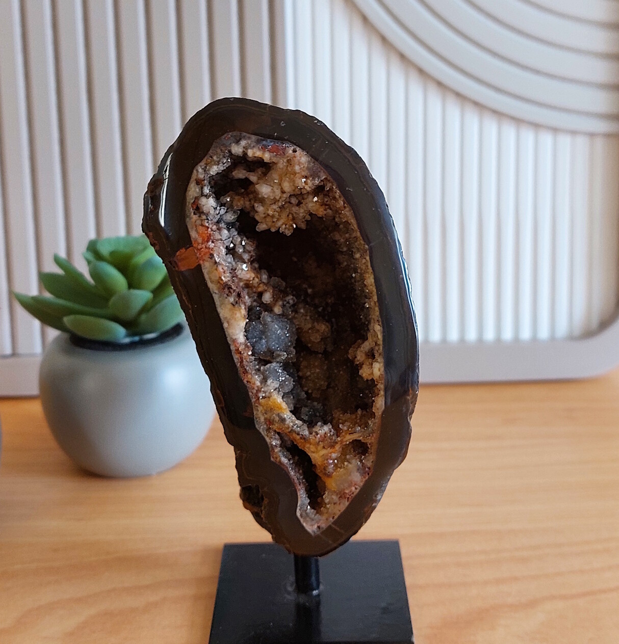 Het is een echte eyecatcher, deze agaat op standaard. Veel druzy / schittering.